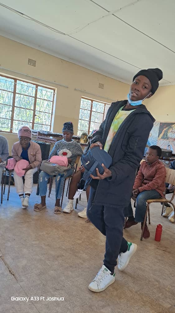 Übergabe des Materials, das dank der Unterstützung von Dumela für das Musikprojekt in Ramatea angeschafft werden konnte. Foto: Fritz Schneider Foundation